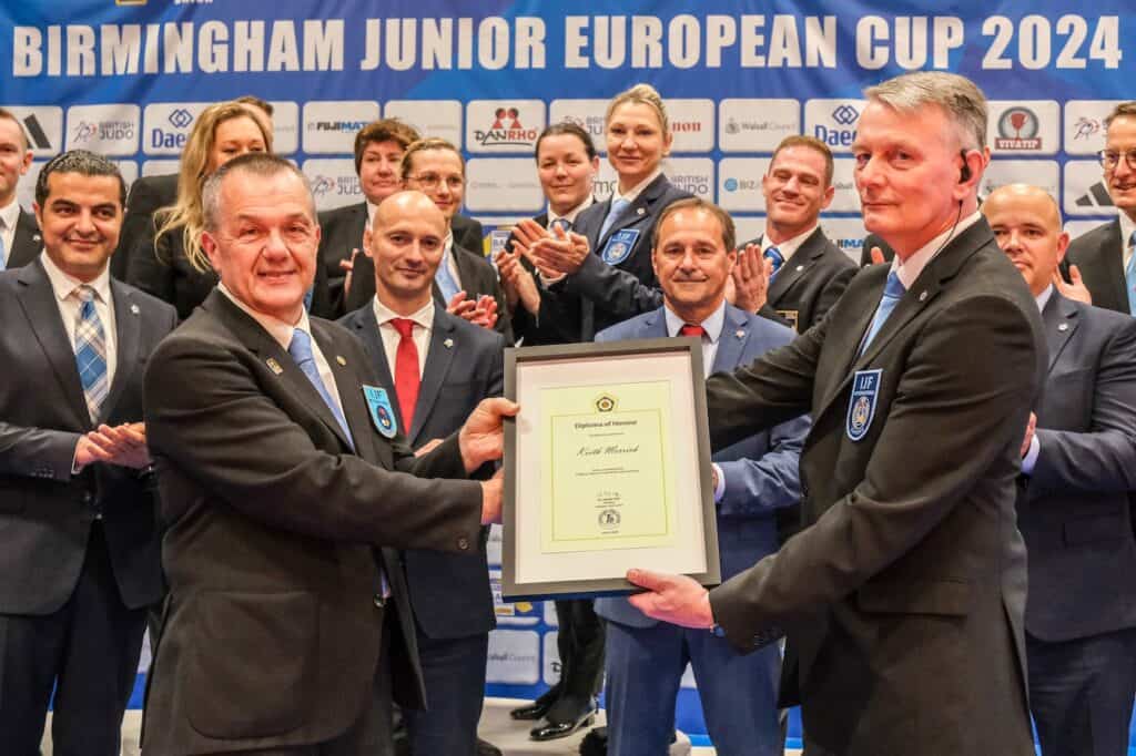 After almost 40 years of refereeing, we also marked Keith Merrick’s retirement from 21 years of international duties with a presentation of a letter of thanks by EJU Commission members at this year’s GBR Junior European Cup. While his distinguished international career draws to a close, Keith will continue refereeing on home soil.