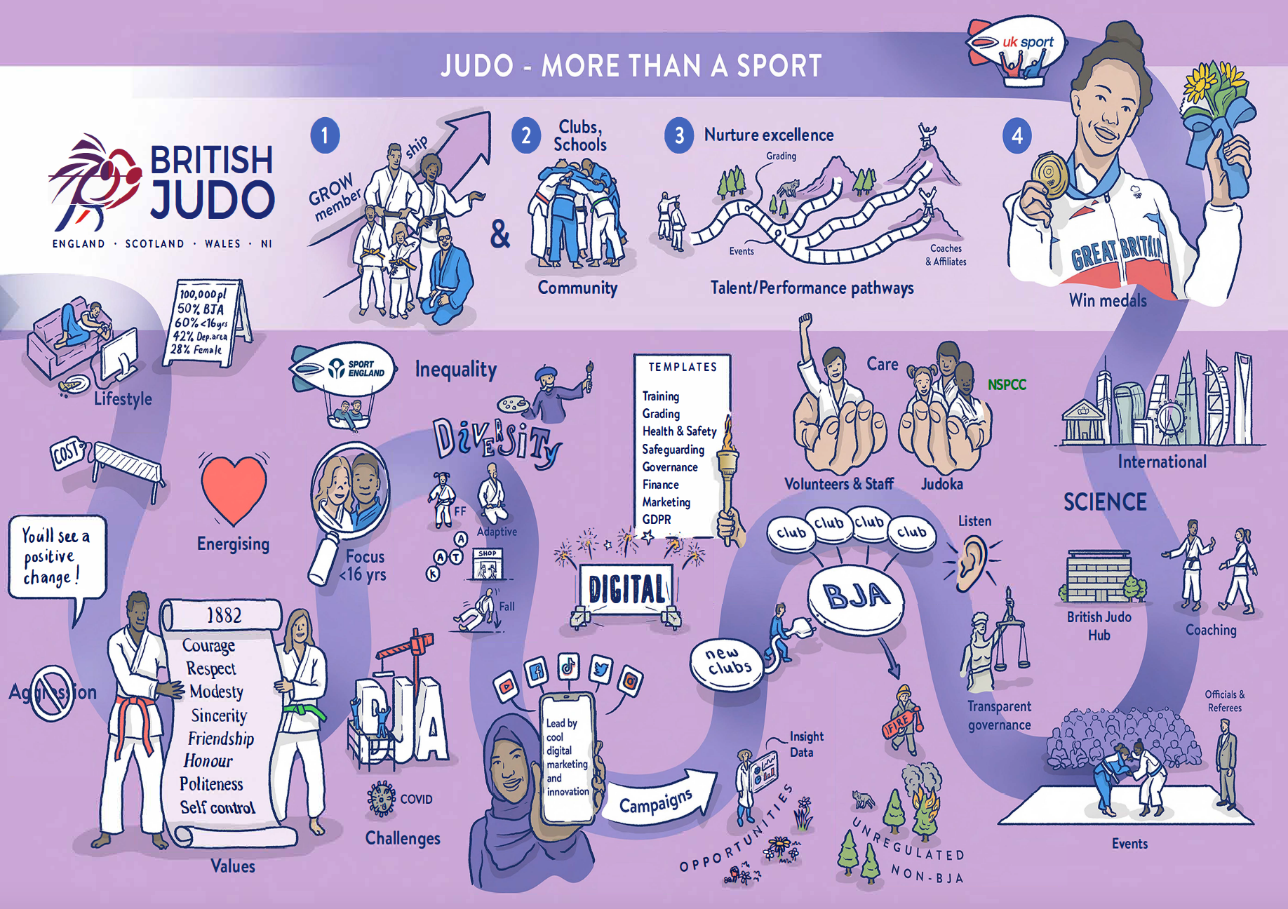 This plan defines our core values and outlines our aim to increase overall participation in Judo, alongside earmarking international success at the Olympics/Paralympics in Paris 2024.